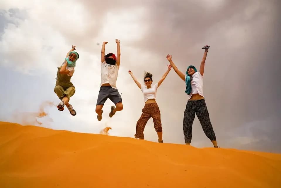 En chemin, nous verrons de nombreuses autres kasbahs et ksour (châteaux) et nous pourrons nous arrêter pour découvrir la célèbre hospitalité marocaine. Le voyage se poursuit jusqu'à l'Erg Chebbi, où nous quittons notre minibus pour entrer dans le désert du Sahara ! Nous atteignons Merzouga, entourée de hautes dunes de sable : ici, nous changeons à nouveau de véhicule et nous nous installons confortablement sur... des chameaux ! Ils nous emmèneront explorer le Sahara au coucher du soleil : une expérience que t’auras du mal à oublier, comme la nuit que nous passerons dans un camp de tentes sous le ciel étoilé.