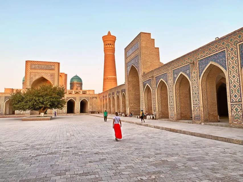 Dès qu’on aura posé nos sacs à l’hôtel, on partira avec notre guide local pour découvrir cette ville fascinante. Au programme : la forteresse Kunya Ark, ancienne résidence des dirigeants, et la mosquée Juma, célèbre pour ses colonnes en bois finement travaillées.